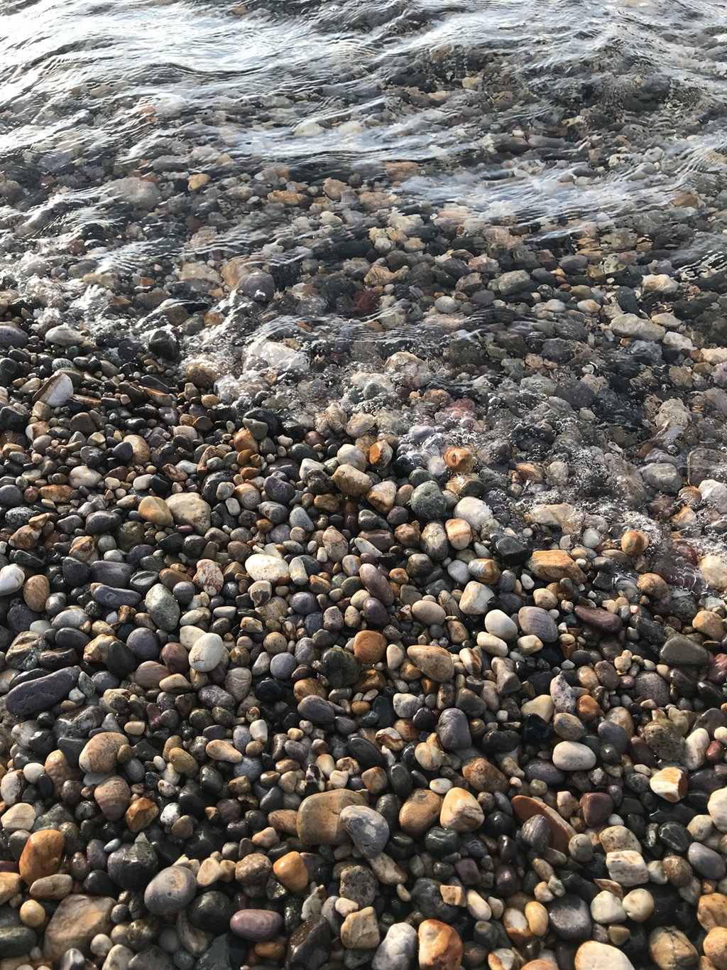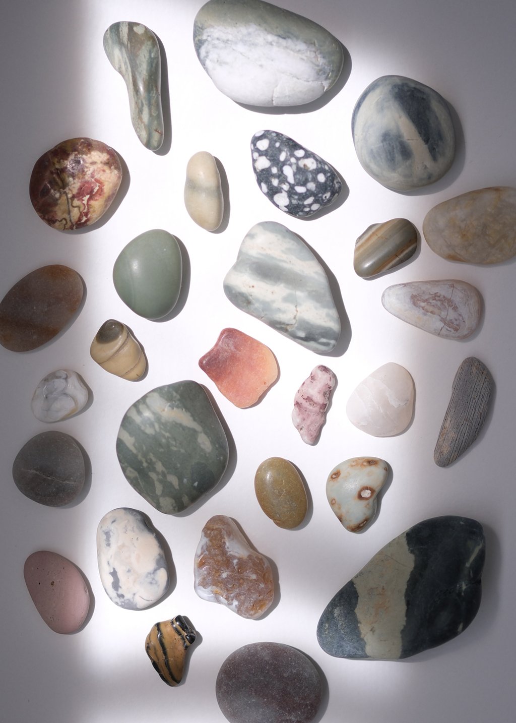 私は基本海で石を拾う。海のほうが色形、触り心地のいい石が多いからだ。川、特に上流では、石が自然に削られる前のごつごつした状態で、中流から下流にかけてもまだザラつきがある。川の水流で石が程よく削られて、やがて海へ流れつき、さらに荒波によって石が洗われ、擦れ、自然に研磨されることによって、石がさらさら、すべすべ、つるつるになっていく。必ず、すべすべつるつるでないといけないわけではないが、基本はきめ細かい表面で、触り心地がいいものが好ましい。あえてごつごつ角張った石を選ぶ場合もあるが、それはかなり稀で、気の迷いか、あるいはとてもいい見立てができたか、その海岸を代表する特徴的な石なので記念に持ち帰るかのいずれかだ。